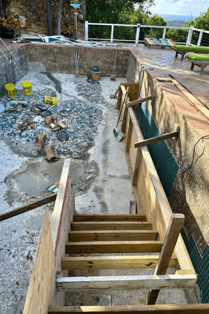 It was kind of sad to watch as “liquid gold” flowed down the driveway. Liquid gold is our water here on island. I was thinking at that time, I wonder how many trucks of WAPA water we were going to need to fill the pool back up? At a cost of … what?? But on the other hand a fixed beautiful pool was on it’s way …